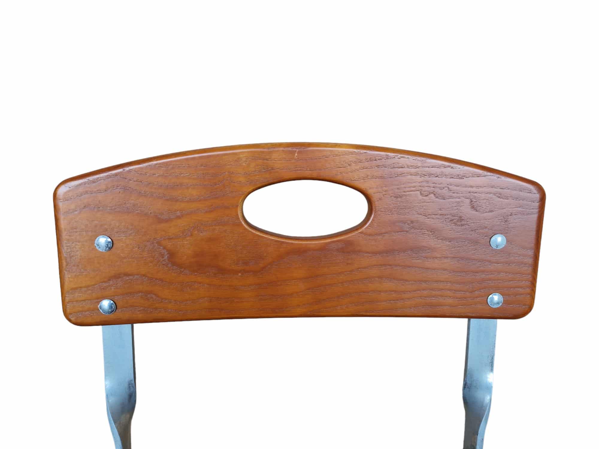 Die Holzleisten des Hochstuhls sind aus robustem Eschenholz gefertigt und in einem ansprechenden Mittelbraun lasiert. Die vier geraden Sitzleisten sorgen für eine stabile und bequeme Sitzfläche, während die gebogene Rückenleiste mit einer praktischen Griffmulde zusätzlichen Komfort und einfache Handhabung ermöglicht. Mit einer Sitztiefe von 35 cm und einer Sitzbreite von 40 cm bietet der Hochstuhl ausreichend Platz, um bequem zu sitzen. Die Sitzhöhe von 82 cm und die Gesamthöhe von 109 cm sind ideal, um an Hochtischen oder Bars Platz zu nehmen.