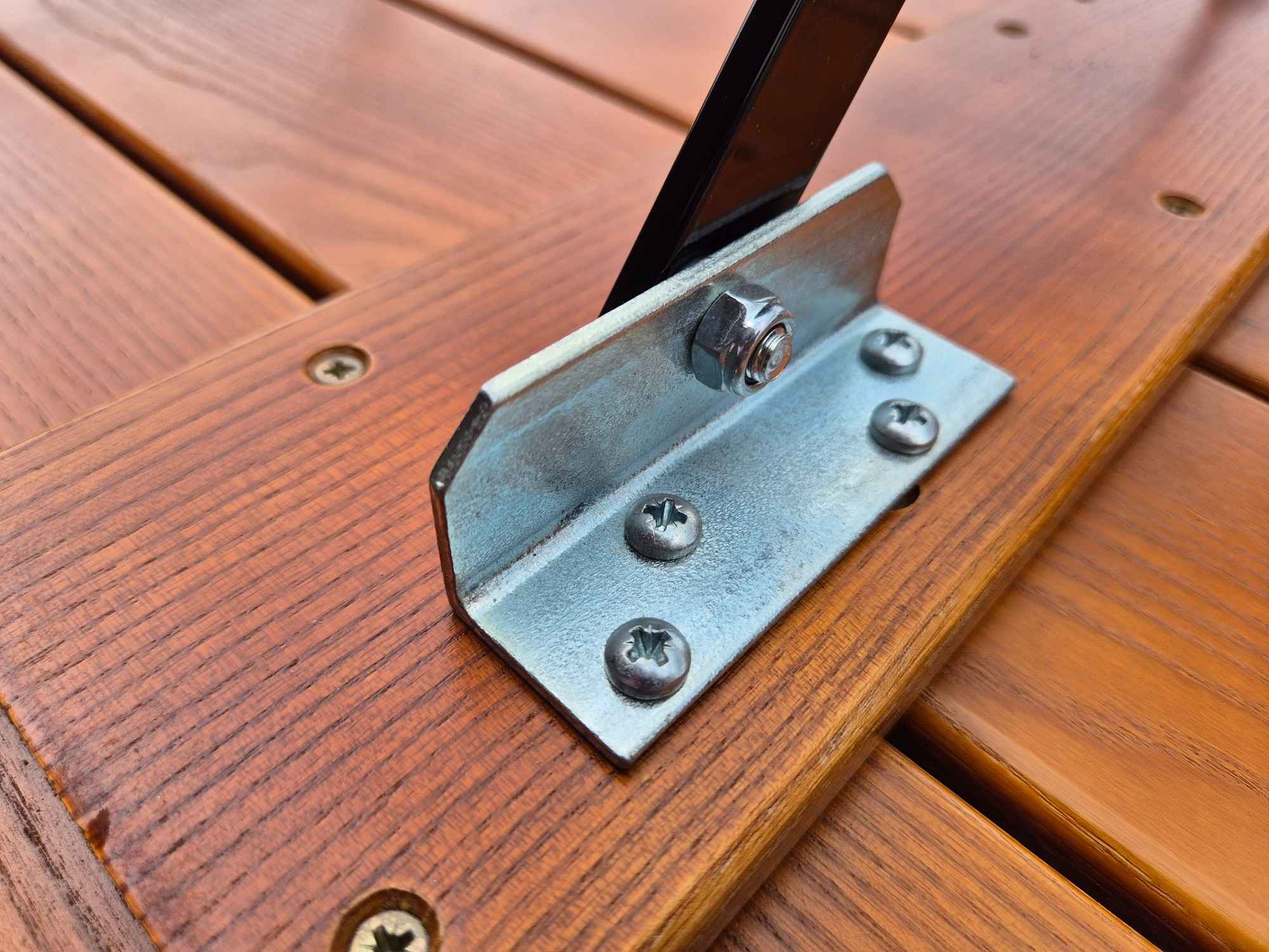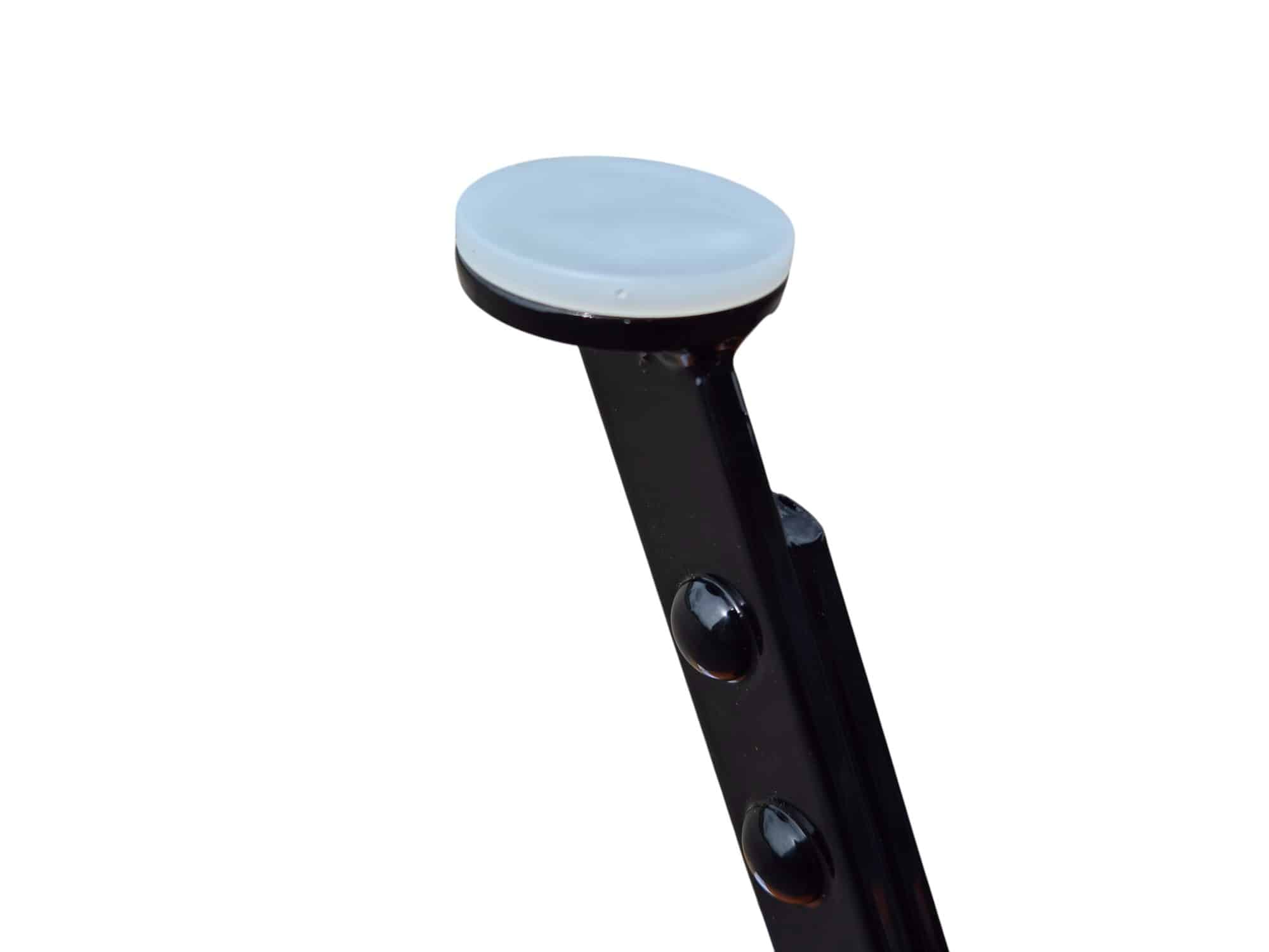 Gefertigt wird das Gestell aus massivem Flachstahl 25 x 6 mm. Es ist galvanisch verzinkt und zusätzlich glänzend schwarz pulverbeschichtet. Diese Kombination sorgt für maximalen Korrosionsschutz und eine edle Hochglanz-Optik. Das Ergebnis ist ein Tisch, der nicht nur stabil und langlebig ist, sondern auch modern und stilvoll wirkt. Vier robuste Kunststoffgleiter schützen deinen Boden vor Kratzern – egal ob auf Steinplatten, Holzterrassen oder Balkonbelägen.